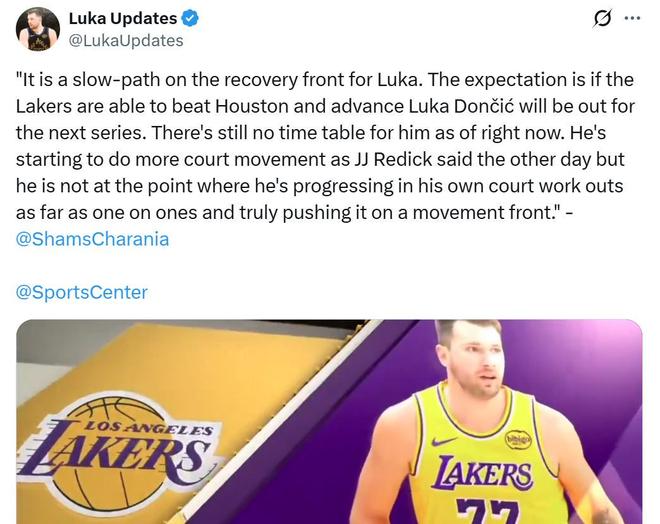 同时Shams指出东契奇的伤病恢复并不理想,在恢复方面十分缓慢,目前的预期是湖人队击败火箭进入次轮,东契奇也将缺席接下来次轮对阵雷霆的系列赛。